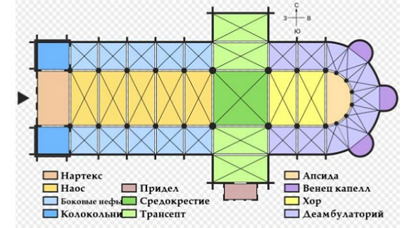 Трансепт (от лат. «за» и «ограда»). Поперечный неф, пересекающий основной продольный неф под прямым углом, за пределами основного здания образующий пониженные куполами выступы — апсиды.