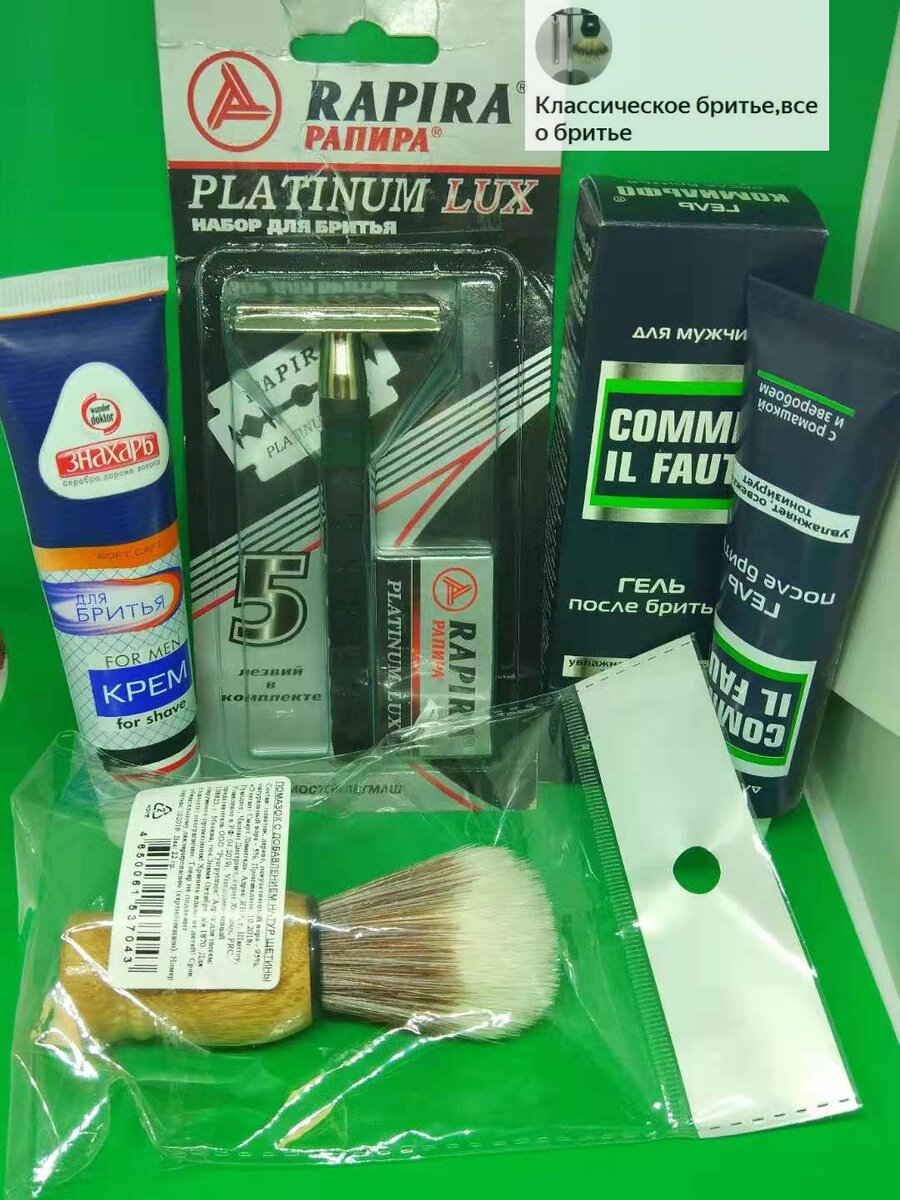 Как то мне стало интересно собрать полный набор для бритья, причем самый бюджетный, но чтобы был он полный, то есть сам станок, лезвия, средство для бритья и после бритья и помазок, и чтобы этого набора хватило не 1-2 раза, а как минимум на несколько месяцев, так же важным критерием было то, чтобы это все можно было приобрести в шаговой доступности и желательно в одном магазине (без заказа через интернет). В итоге в одном из крупных гипермаркетов, который есть практически в каждом городе России я приобрел такой полный набор! В конце статьи я расскажу как я этим всем побрился, о плюсах и минусах этого набора. 1) Классический станок для бритья Рапира в комплекте с 5-ю лезвиями Рапира платина люкс, всего за 104,5руб! 2) Крем для бритья Знахарь, фабрики Шанте Бьюти. Всего за 16,59руб! В составе экстракт зверобоя, который успокаивает и защищает кожу, глицерин - смягчает и увлажняет, кокосовое масло - препятствует образованию сухости. Сам крем практически не пахнет, это может понравится мно