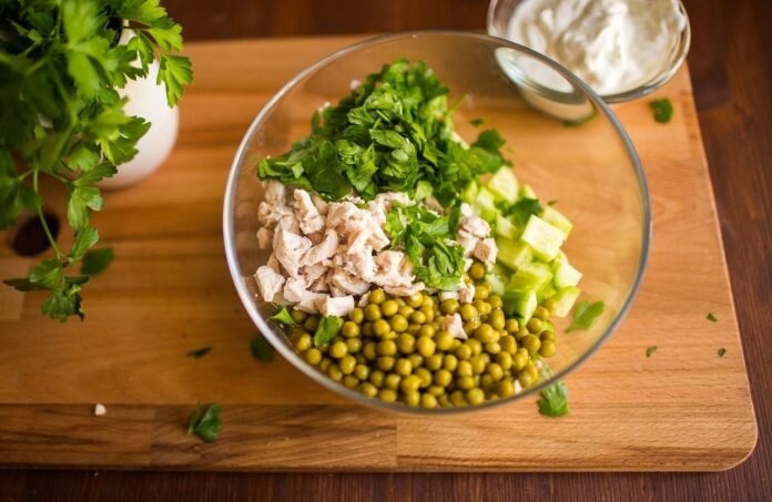 У каждой хозяйки должны быть рецепты салатов на случай форс-мажора – Вы никого не ждете, а гости… нагрянули. Значит, нужно быстренько накрыть на стол. Рецепты, предложенные в нашем топ 10 самых быстрых салатов, выручат Вас при любом застолье. 10 Салат «Леди» Ингредиенты: 350 г куриного филе, 150 г огурцов, 150 г консервированного зеленого горошка, 3-4 ст. л. майонеза, пучочек зелени укропа, соль – по вкусу. Приготовление. – Куриное филе отварить и порезать кубиками. – Огурцы порезать кубиками. – Зелень укропа измельчить. – Смешать курятину, зеленый горошек, огурцы и укроп. – Посолить по вкусу, добавить майонез и перемешать. 9 Салат «Мечта» Ингредиенты: 150 г крабовых палочек, 1 помидор, 2 ст. л. майонеза, 1-2 зубчика чеснока, 75-100 г. твердого сыра, 30 г пшеничных сухариков. Приготовление. – 1 слой: порезанные кубиками крабовые палочки. – 2 слой: удалить из помидора сочные семена, мякоть нарезать кубиками. – 3 слой: сыр и чеснок, потертые на мелкой терке и смешанные