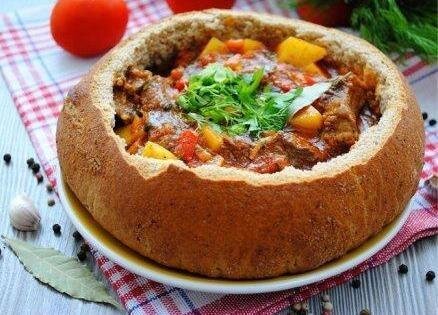 Это необычное блюдо однозначно ошеломит ваших друзей и родных одним только внешним видом. Не каждый день приходится кушать мясной гуляш не из привычной посуды, а из буханки хлеба. Беспроигрышный вариант для праздничного стола, гости будут в восторге! Необходимые продукты: 600г телятины