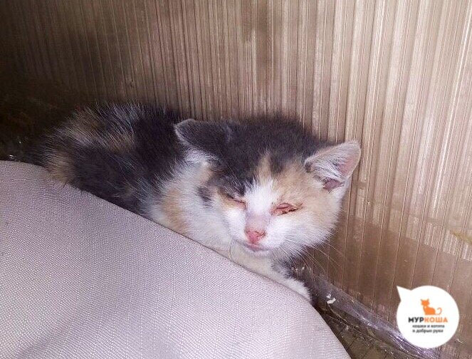 Эта трёхцветная красавица попала в «Муркошу» ещё котенком. Наш администратор нашла Павлину на улице в ужасающем состоянии: грязная, истощенная, а глазки залеплены гноем.