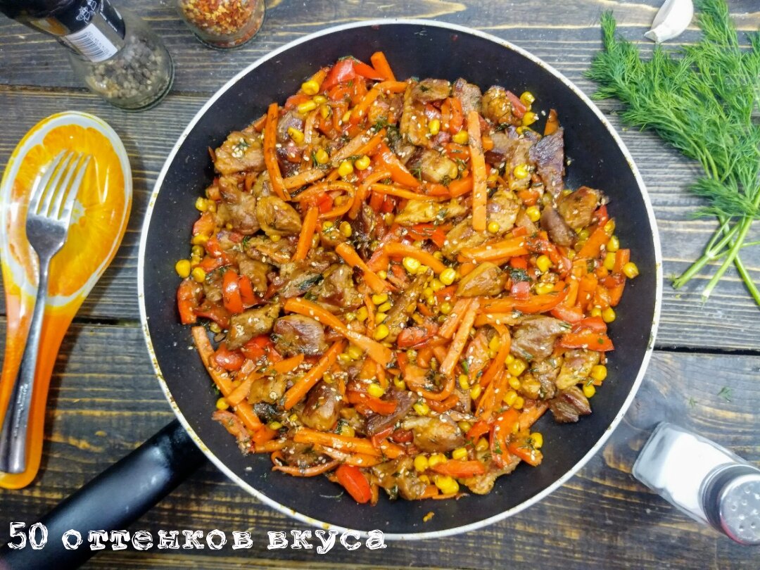 Еда должна быть не только вкусной, еда должна быть и аппетитной на вид! Согласны со мной? Я поделюсь с вами рецептом блюда, которое очень просто и быстро можно приготовить, когда хочется чего то такого... Яркое, аппетитное и очень ароматное блюдо - залог отличного настроения! Я взял кусок хорошей, не жирной свинины и нарезал его небольшими кусочками. Затем, я обжарил мясо до аппетитного золотистого оттенка на смазанной оливковым маслом сковороде. Далее, я в сковороду добавил консервированную сладкую кукурузу, нарезанную тонкой соломкой морковь и болгарский перец. Помешивая, всё обжарил около 7-10 минут до мягкости овощей. Соевый соус очень быстро пригорает. Так что не зеваем! Последний штрих! Я сделал мощность плиты на минимум, добавил в сковороду мелко нарезанный укроп, кунжут, влил соус "терияки", по вкусу посолил и обжарил ещё 2-3 минуты постоянно помешивая до полной готовности. 25-30 минут и ваш обед или ужин готов! Это блюдо может быть самостоятельным, но если