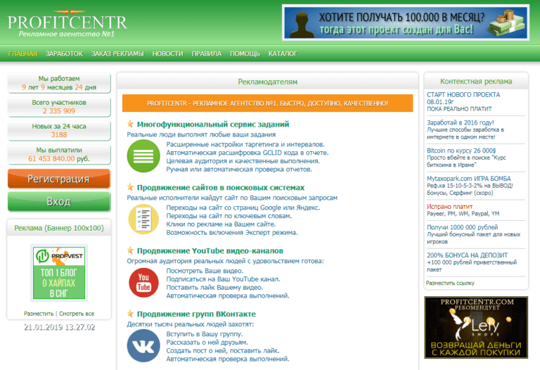 ProfitCenter — универсальный сервис, предлагающий множество разных способов зарабатывать деньги. Пользователи зарабатывают деньги за просмотр рекламы, серфингов, также чтение писем, за лайки, разные комменты на ютубе, вк, в фейсбуке, в инстаграме и так далее... А еще Вы можете пригласить через вашу реферальную ссылку (эта ссылка дается Вам при регистрации) ваших друзей которые тоже могут зарабатывать деньги как и Вы, при этом Вы будите получать проценты от их действий.. Так же через profitcenter, Вы можете продвигать свои странички в разных соц сетях становлась рекламодателям.. И главное в этом проекте двойная регистрация запрещена, об этом поподробнее Вы узнаете после регистрации на проекте. Вот ссылка на регистрацию в profitcentr... https://profitcentr.com/?r=powerofmoneyn1 Желаю всем хороших заработков