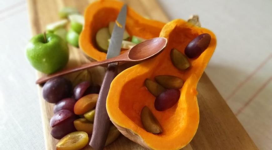 И так, нам потребуется: 1. Два прямых отростка из плеч; 2. Тыква продолговатой формы; 3. Мука пшеничная; 4. Сахар или сахарная пудра; 5. Манка; 6. разрыхлитель для теста; 7. Растопленное сливочное масло; 8. корица молотая, имбирь сушеный, фруктовый сок, яблоко одно, клубника, слива, мед. Собираем все ингредиенты в кучу и начинаем готовить. Режем тыкву пополам, чистим, убираем все лишнее и смазываем изнутри медом. Затем отдельно смешиваем муку, сахар, манку, разрыхлитель, добавляем к этому растопленное масло и перемешиваем и вливаем в половинки тыквы. Далее добавляем ягоды, яблоки и идем запекать в духовке на 180 градусов, где-то час времени. На выходе скажу так, у меня ни чего не получилось и все это дело смело ушло в мусорное ведро :)