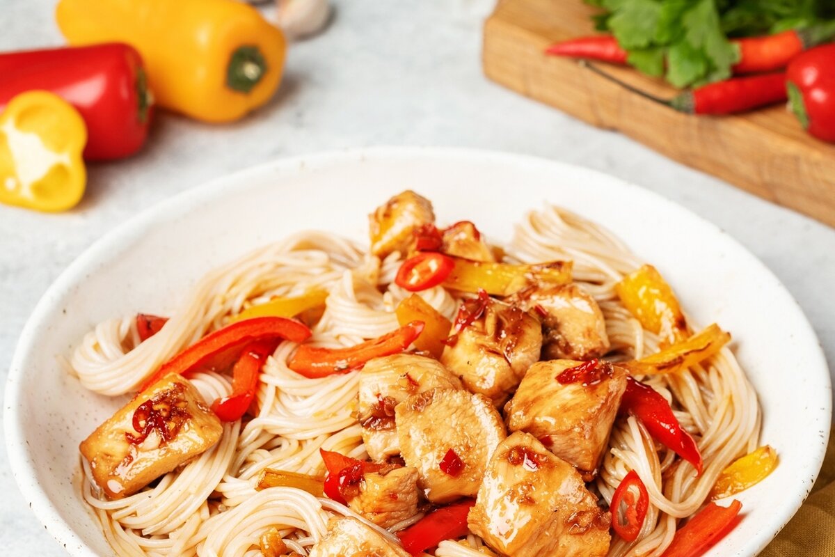 А вот ещё секрет бонусом: для приготовления соуса совсем необязательно долго и усердно измельчать крошечный зубчик чеснока. Достаточно просто раздавить его плоской стороной ножа, поджарить с остальными ингредиентами, а дальше чеснок просто выкинуть (свой вкус он уже отдал). Как проверить? А приготовить лапшу с имбирно-чесночной курицей