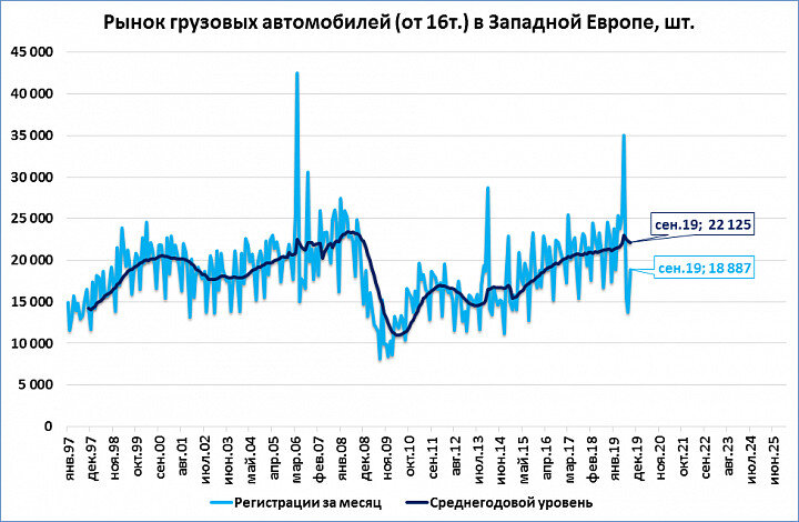 Рынок грузовиков в Западной Европе в сентябре показал худший результат за последние 5 лет: 18 887 шт. В последний раз в сентябре рынок был хуже только в 2014 году (17 414 шт.). Падение к сентябрю 2018 года составило 10,6% При этом последние 12 месяцев на 4,2% больше АППГ, Продажи за 9 месяцев (с начала года) тоже в плюсе: +6,1% Если такие темпы сохранятся до конца года, то мы ещё можем увидеть исторический рекорд по итогам 2019 года: Компания Вольво сообщает о падении заказов на грузовики в Европе. Мы тоже ожидаем дальнейшего падения продаж.