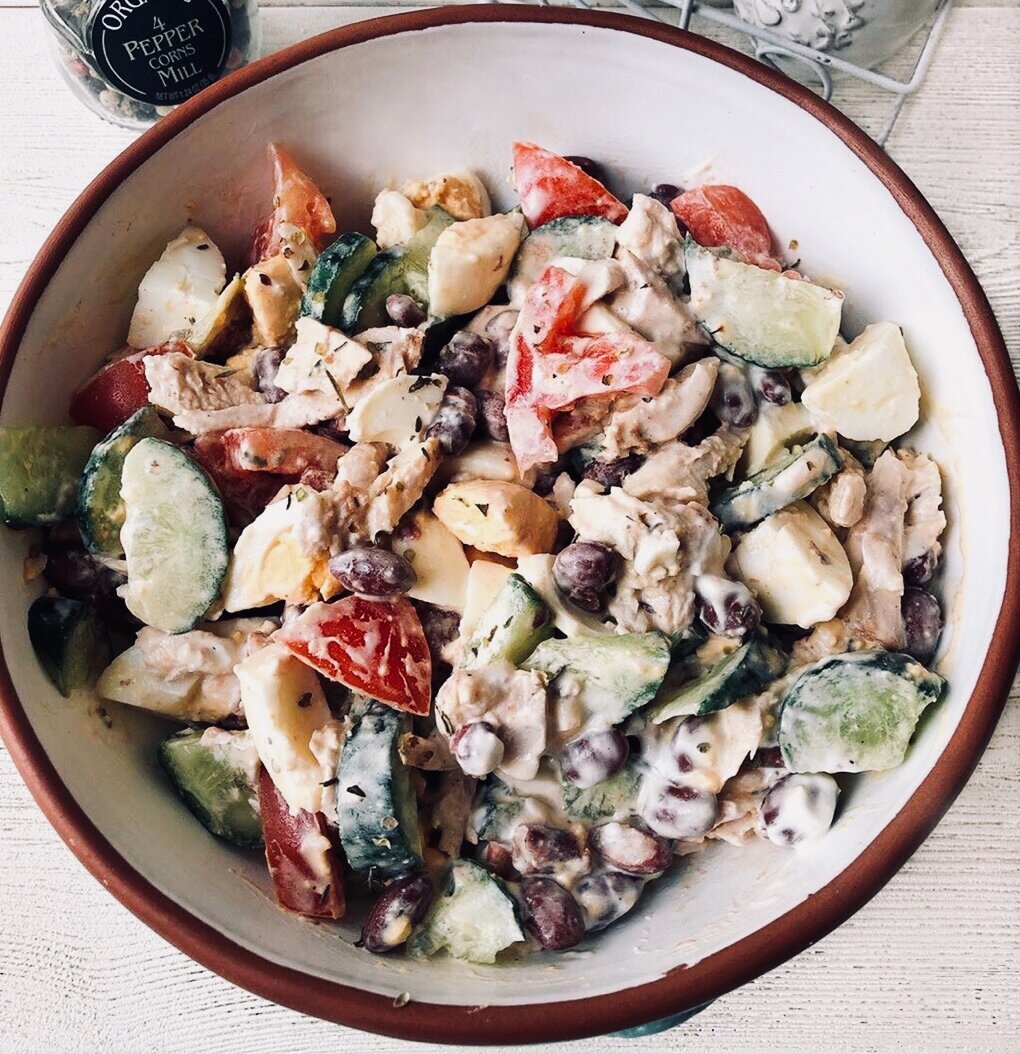Простой в приготовлении и полезный салат🔪 Вот что нам понадобится: 1️⃣ Куриная грудка - 150 грамм 2️⃣ Огурец - 1 шт 3️⃣ Помидор - 1 шт 4️⃣ Яйца - 3 шт 5️⃣ Красная фасоль - 150 грамм 6️⃣ Сметана, соль Приготовление: Яйца отварить, готовую куриную грудку, огурец, помидор и яйца нарезать. Все смешать, заправить сметаной, посолить.