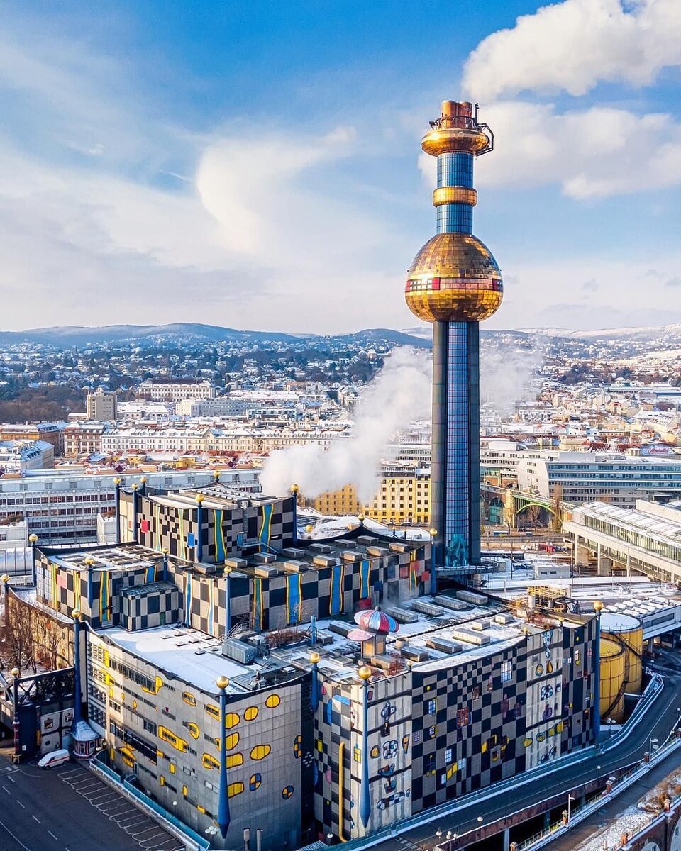 Я как-то проезжала это здание на велосипеде со стороны реки. Глазам не поверила, когда открылся такой вид. А позже очень удивилась, когда мне рассказали, что это мусоросжигательный завод. Его схожесть со знаменитым домом в центре Вены, у которого всегда толпы туристов, не случайна — оба здания авторства знаменитого архитектора Фриденсрайха Хундертвассера. Мастер выступал за единение человека с природой и называл стены домов «третьей кожей», а окна — «глазами». Но если Дом Хундервассера можно найти во всем путеводителях по Вене, то это здание почти всегда остается в стороне. Первое здание завода, построенное в 1971 году, сильно пострадало в ходе пожара в 1987. Мэр Вены того времени при перестройке фабрики поставил перед городом весьма нетривиальную задачу — создать новый Шпиттелау максимально экологичным и сделать его произведением искусства. Не сразу, только обговорив ряд условий, знаменитый художник и архитектор берется за проектирование. Сейчас завод действительно оснащен какими-то