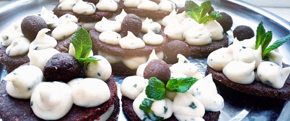 Семечку перемалываем в кофемолке, кокос натираем на мелкой тёрке, листья мяты мелко нарезаем. Соединяем в чашке все ингредиенты для основы, вымешиваем густое тесто, раскатываем его на присыпанной мукой поверхности в пласт толщиной 5 мм., затем чашкой или специальной формой вырезаем кружочки. Выкладываем их на противень, застеленный пергаментом.