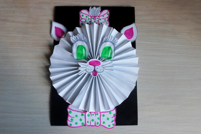 Если душа требует творчества, то обязательно попробуйте вместе с ребенком создать такую милую аппликацию с белой кошечкой. Поделка смотрится очень шикарно, хотя для ее создания потребуются только белая бумага, клей, ножницы и фломастеры! Этот набор точно есть у любого ребенка. Данная аппликация дает возможность маленькому человеку фантазировать и заменять все детали на другие. Например, вы с малышом можете выбрать цвета, которые нравятся именно ему. Также не запрещается делать глазки или рот другой формы, как впрочем и бантики! Можете смело выдумать что-то свое и украшать аппликацию на свой манер. Нам потребуется: Берем целый альбомный лист, начинаем сворачивать его гармошкой. Сначала сгибаем на себя. Потом, наоборот, отгибаем от себя. Поочередно сгибаем альбомный лист то в одну, то в другую сторону, пока свободный край не закончится. Смазываем половинку клеем. Соединяем половинки, приглаживаем и удерживаем пальцем несколько секунд, чтобы клей успел зафиксировать заготовку. Расправляе
