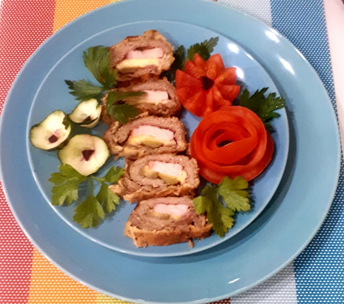 Когда каждый день готовишь для своей семьи, то каждый день ломаешь голову на тему новых рецептов. Хочется удивить всех, да и самой одно и тоже есть надоедает. На этот раз, я решила приготовить говядину с беконом и сыром, так как у меня кусочек говядины (толстый край) лежит в холодильнике. Мясо отделила от костей и нарезала толщиной 5-7 мм, из куска у меня получилось пять отбивных. Сложила кусочки (по одному) в пакет салафановый, чтобы брызги не летели по сторонам, когда отбиваешь. Отбила хорошо, посолила, поперчила, нарезала пластинами сыр толщиной 2 мм. и бекон также. Приготовила три тарелки для панировки: одну с мукой, другую с сухарями, а третью с яцами. Сыр с беконом на середину сложила на отбитые кусочки мяса и завернула аккуратно. Далее панировала в муке, в лейзоне, в сухарях и жарила на сковороде. После еще доготовила в духовке - 15 минут. Готовые фаршированные отбивные, достала из духовки и нарезала на маленькие кусочки. Можно подавать с гарниром, или без гарнира, только с ов