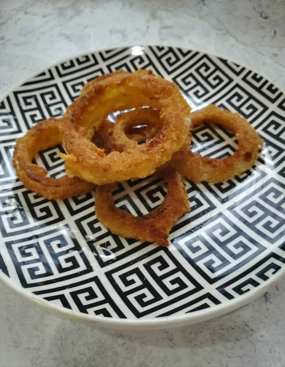 Зачастую в жизни бывает такое, что захотелось съесть что-нибудь из меню ресторанов быстрого питания, но Вам хочется сделать это сейчас и дома, и я расскажу вам один из лёгких и вкусных рецептов, такой как луковые кольца. Всё что Вам для этого нужно это: • несколько луковиц (желательно покрупнее) • небольшой кусок сыра • пару яиц • немного муки и панировочных сухарей, ну и соль со специями по вкусу. Далее нарезаем лук кольцами толщиной 0.5-1 см, тонкими полосками разрезаем сыр и нарезаем его кубиками такого же размера как и толщина лука. Приготовленную муку и панировочные сухари насыпаем в разные удобные ёмкости и в отдельную ёмкость взбиваем яйца с солью и специями. Следующим действием мы берем кольца лука разного диаметра так чтобы между ними помещались наши кусочки сыра, проделываем это со всеми кольцами и убираем их на 15-20 минут в морозильник чтобы они не разваливались при жарке. Достав кольца из морозильника разогреваем в сковороде масло в таком количестве, чтобы к