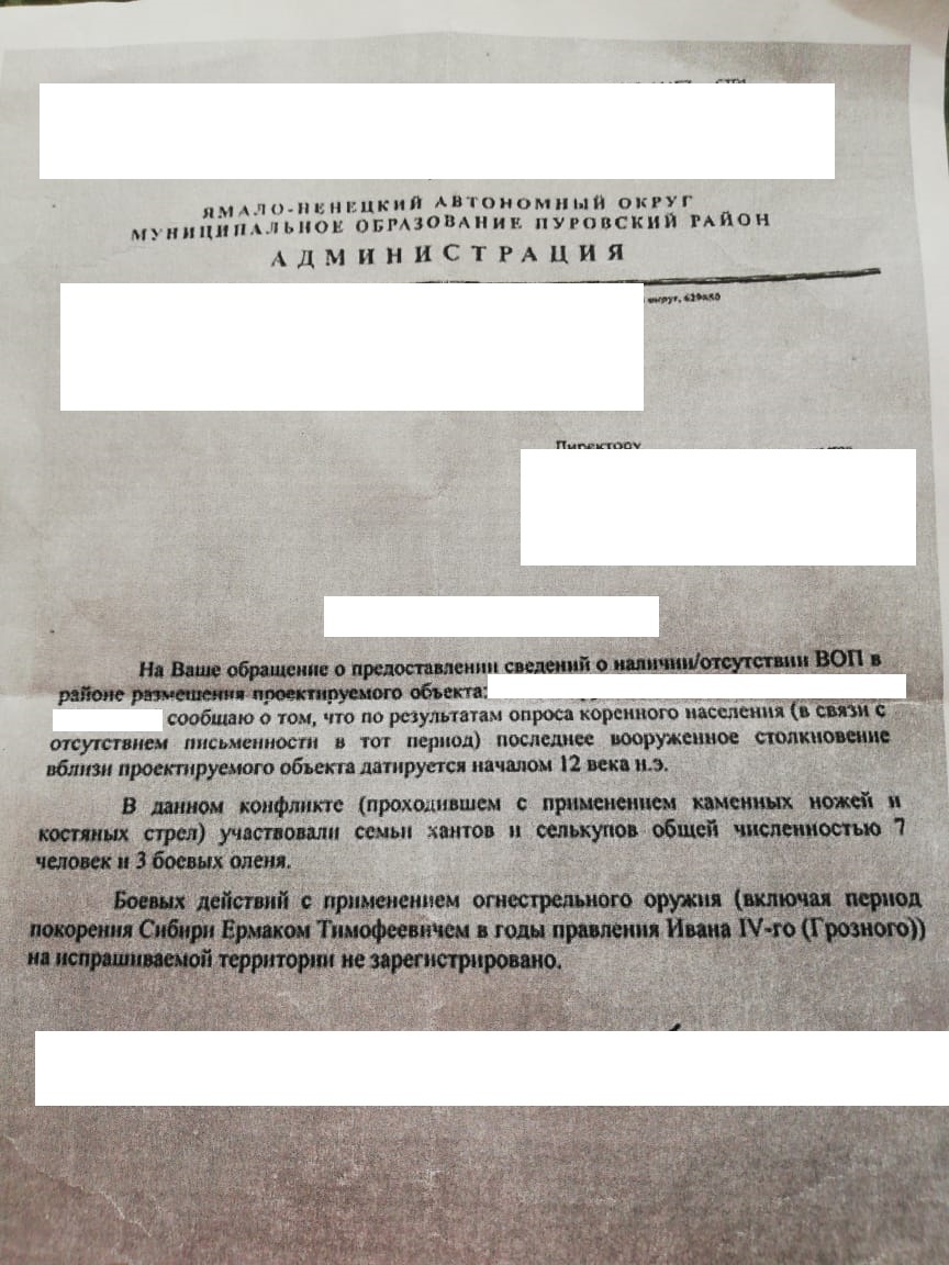 На ваше обращение о предоставлении сведений о наличии/отсутствии ВОП в районе разремещения проектируемого объекта: "........", сообщаю, что по результатам опроса коренного населения (в связи с отсутствием письменности в тот период) последнее вооруженное столкновение вблизи проектируемого объекта датируется началом 12 века н.э.