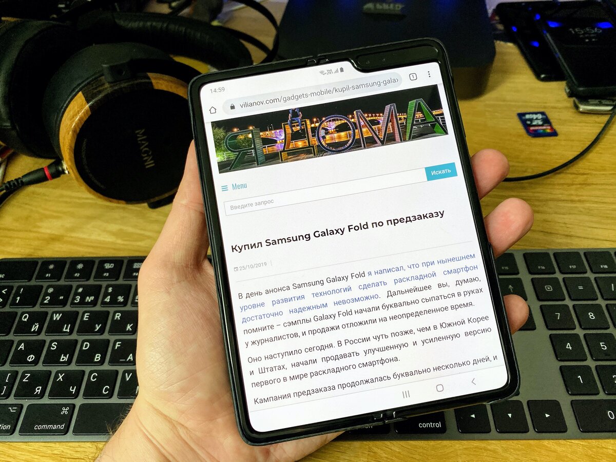 В субботу вечером сел записывать ролик про Samsung Galaxy Fold, но солнце решило сесть по-зимнему рано, и – не сложилось. Ну ничего, встал сегодня пораньше. Проблема была в том, что я не хотел включать аппарат без камеры в качестве свидетеля. Первые впечатления не подделаешь, надо было их зафиксировать.