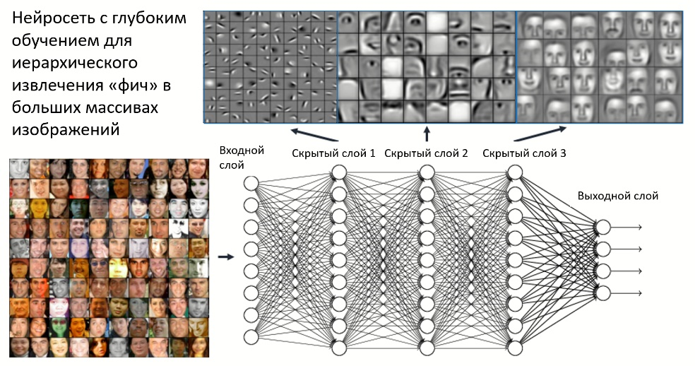 Источник: https://shalaginov.com/2019/10/27/6551/ Термин «нейросети» (Neural networks) был очень популярен в конце 1980-х – начале 1990-х годов. Затем его цитируемость стала снижалась, поскольку их потенциал так и не удалось реализовать имеющимися в начале 2000-х годов средствами. Нейросети состоят из слоёв т.н. “нейронов”. Эти сети могут передавать информацию только в одном направлении и обучаются на примерах (для классификации или регрессии). Мозг приматов работает примерно также, поэтому была надежда на то, что, использовав больше слоёв в нейросети, можно будет получить более совершенные модели объектов. Однако, впоследствии выяснилось, что обучающие модели с большим количеством слоёв хорошо не работают. Поэтому, исследователи пришли к выводу, что только «тонкие» (Shallow) модели в 1-2 слоя могут хорошо обучаться. Стандартная нейросеть имеет только один или два слоя представления данных (Shallow neural network, на рисунке, буквально: «мелкая нейросеть»). Глубокие нейросети (deep