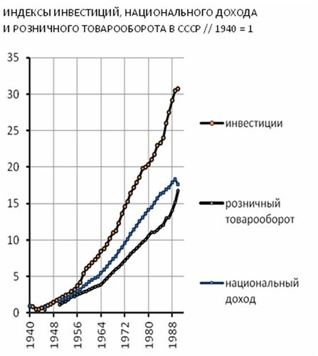 На графике видно, что в СССР рост капиталовложений превышал рост объема производства, а последний — рост объема потребления. Этот баланс, который обеспечивал устойчивое развитие всей системы. Динамика трех показателей — инвестиций, производства и потребления — не проявила накануне перестройки никаких признаков кризиса.