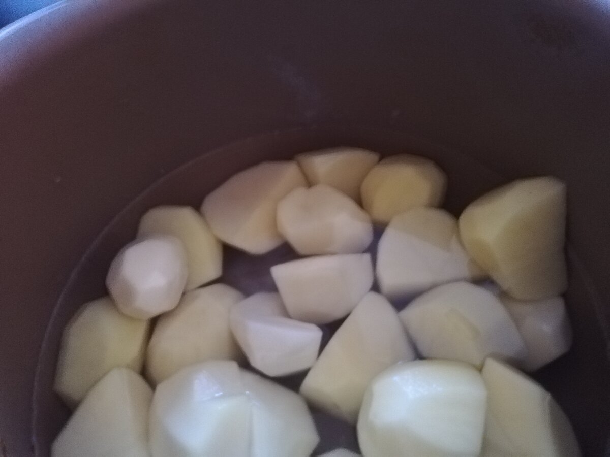 Потом подумала, что котлеты на пару будут бледными и добавила куркуму для цвета. Заранее вскипятила чайник и залила в чашу мультиварки кипяток, в который положила картофель - таким образом можно сэкономить время и деньги, то есть электричество.