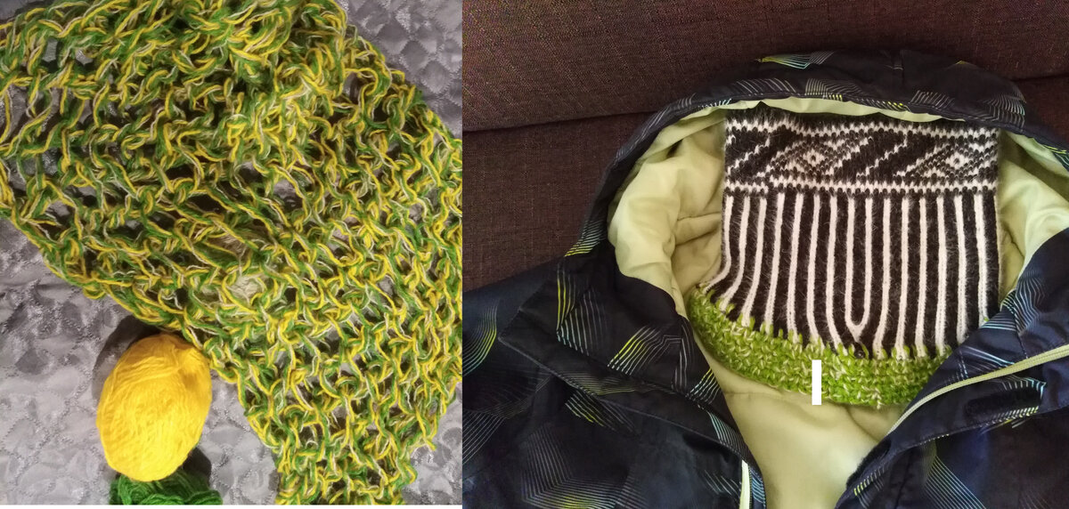 1. Снуд без крючка и спиц Снуд — это вид шарфа. Он сшит или связан по кругу, не имеет ни начала, ни конца, поэтому его еще называют «бесконечный шарф» " У меня вариант похож на рыбацкую сеть. Для такого шарфика нужна толстая объёмная пряжа. Я использовала три вида пряжи, правда не пушистые. Все они мягкие, но тонкие - поэтому я их объединила. Утепляемся к осени-зиме без знаний о вязании. Но если знания в наличии - будет еще легче.Плести/ вязать в такой манере оправданно быстро и уходит пряжи - приблизительно 150 грамм (представленная пряжа вместе весит 300 грамм, шарф близок к кону - ушла половина)