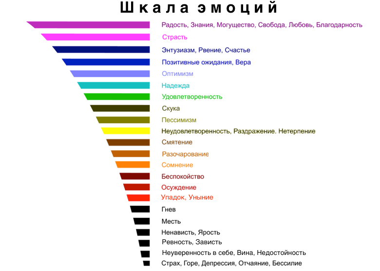 Посмотрите на эмоциональную шкалу и определите для себя, где вы сейчас? Как только вы понимаете, что вы не в лучшем положении, то сразу начните думать те мысли, от которых вам будет хорошо - это самый первый шаг
