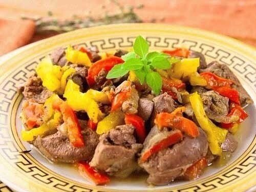 куриная печень - 500 г болгарский перец - 300 г лук - 150 г 5-7 веточек тимьяна (по желанию) томатный сок для тушения(примерно 1 стакан) соль, перец по вкусу
