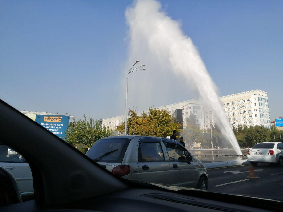 В центре Ташкента прямо из асфальта забил фонтан горячей воды. Видео