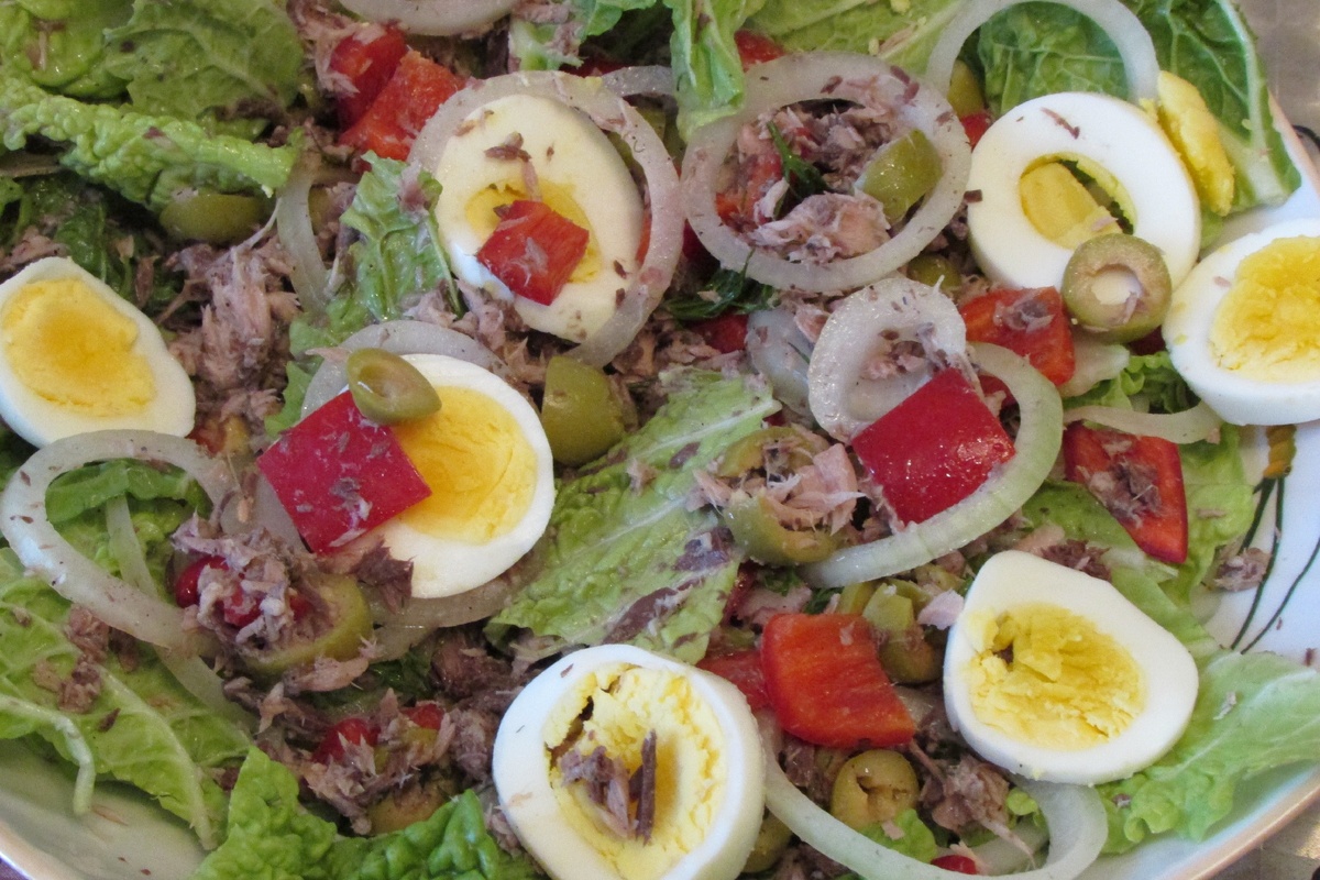 На 4 порции: Для заправки: 1. Яйца сварите вкрутую, слейте, обдайте холодной водой, очистите и дайте остыть. Перец разрежьте пополам, освободите от семян и помойте. Нарежьте кубиками величиной 1,5 см. Оливки нарежьте кружочками. 2. Лук очистите и нарежьте тонкими кольцами. Салат очистите, помойте и обсушите. Порвите руками на небольшие куски и выложите их на тарелки. 3. Нарезанный перец, кольца лука и оливки выложите на листья салата. Слейте жидкость с тунца, разомните вилкой. Положите на тарелки между овощами. 4. Зубчик чеснока очистите, выдавите через пресс в небольшую миску. Добавьте уксус, масло, соль и перец. Помойте и обсушите зелень ( петрушка, укроп ). Листочки оборвите и мелко их нарубите, добавьте к заправке, перемешайте. Вылейте заправку в салат. Яйца нарежьте кружочками и украсьте салат. К этому блюду подойдёт свежий белый хлеб. Приятного аппетита.
