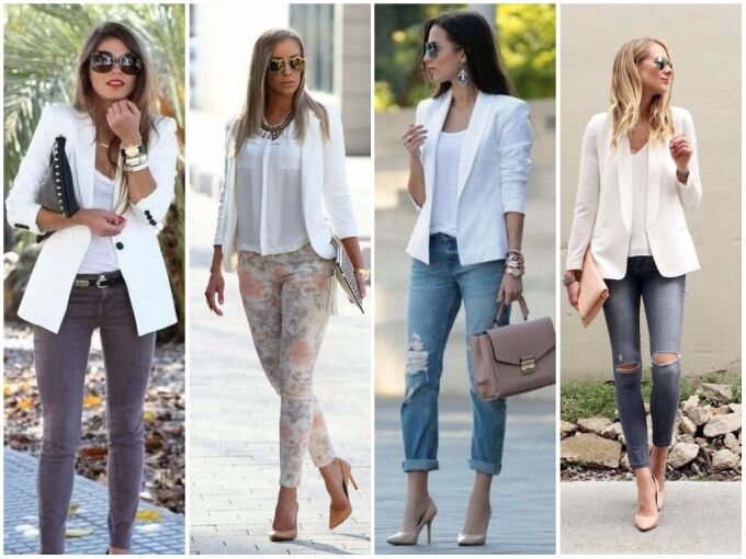 Многие женщины со скептицизмом относятся к белому пиджаку. Всему виной его маркость. Между тем, его можно смело назвать базовой вещью и альтернативой черному пиджаку. Он действительно универсален и выглядит не столь банально и скучно, как черный. Существует немало фасонов, но лучше остановиться на свободном пиджаке, без какого-либо декора – чем проще, тем лучше. Тогда его будет легко комбинировать с разной одеждой. Важно, чтобы пиджак сел по фигуре. Он ярок само по себе, и если будет не по размеру, весь образ потерпит крах. Дуэт белого и черного Итак, с чем же носить белый пиджак? Начнем с самого простого – сочетания белого и черного. Вы можете дополнить его черными брюками или юбками – без разницы. Но чтобы лук не был скучным, играйте с фактурой. Пусть пиджак будет из легкой ткани, а низ – из кожи или твида. Если вниз надеть черную майку, получится расслабленный образ. Дополните его короткой черной юбкой, ботильонами и можно смело отправляться в клуб. Образ с джинсами Еще одна прост