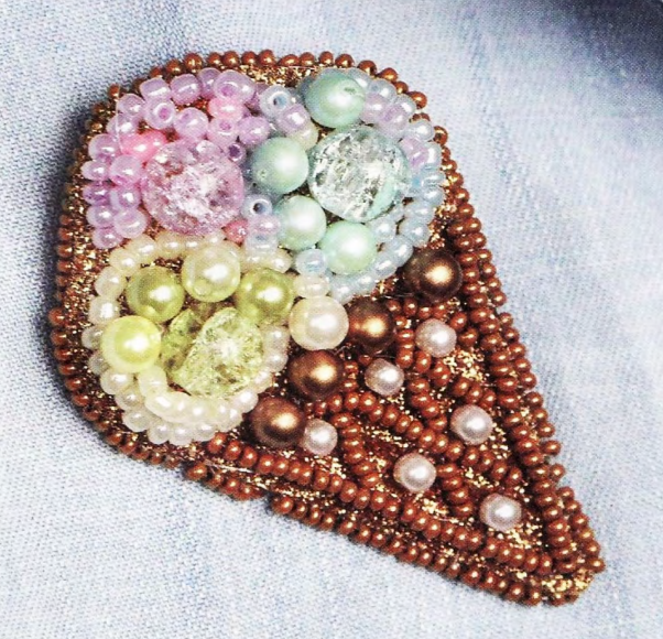 Вам понадобится: Бусины разного цвета и размера; Бисер разного цвета; Фетр; Мононить; Заготовка для броши; Карандаш или мел для кроя; Маникюрные ножницы; Иглы для бисера; Эскиз броши (как Ваша брошь будет выглядеть Вы решаете сами рисуя эскиз на бумаге). Для начала нужно определиться в том как будет выглядеть Ваша брошь, на листе бумаги рисуем эскиз, определяемся с ее размерами и где что будет каким цветом. Моя брошь будет выглядеть вот так На лицевой стороне фетра рисуем контур будущей броши (не вырезаем, всю работу делаем на всем куске фетра). Вставляем мононить в иглу и пришиваем бисер нужных цветов по контуру шариков мороженого. По центру шариков мороженого пришиваем бусины. Свободное пространство шариков мороженого заполняем разными бусинами и бисером разных цветов. Бисер (у меня золотого цвета) пришиваем по контуру вафельного стаканчика и им же делаем ромбы внутри. Вдоль верхнего края стаканчика нашиваем бусины темно-желтого цвета. По центру ячеек из бисера пришиваем бусины.