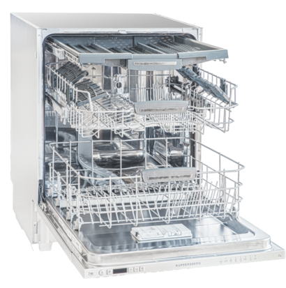 - Регенерирующая соль для смягчения воды. Соль в посудомоечной машине предотвращает образование белого налета и накипи. Содержится в таблетках для посудомоек или приобретается отдельно. Во многих машинах — например, Kuppersberg GL 6033, — имеется специальный резервуар для соли. В инструкциях к другим моделям — таким, как Bosch SPV45DX10R, — указывается, что соль и ополаскиватель в составе комбинированных средств действует в воде до определенной жесткости — в большинстве случаев 21°dH. Для более жесткой воды их нужно загружать отдельно.