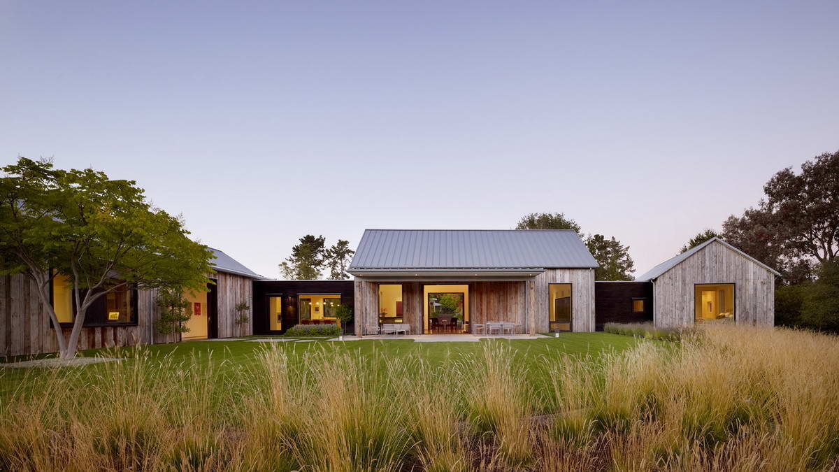 Напоминающий обветренный сельский амбар с жестяной крышей и расположенный в живописном окружении, комплекс состоит из трех основных структур — просторного домашнего офиса, домашнего кинотеатра и роскошного номера для гостей, — соединенных между собой проходами. Это эффектное динамичное пространство, отдельное от существующей главной резиденции, предназначенное как для развлечений, так и для отдыха. Задумывая это дополнение, архитекторы воспользовались народной архитектурой района, особенно его выветрившимися сельские зданиями с двухскатной металлической крышей. Для наружных стен команда использовала вторичный дуб из сараев Кентукки, наряду с черным деревом. Металлические листы — окрашенные, чтобы напоминать цинк — использовался для крыши. В отличие от брутального экстерьера, дизайн интерьера призван выглядеть свежим и современным — комнаты с белыми стенами и полированными поверхностями в меру минималистичны. Большие стеклянные проёмы обеспечивают прочную связь с живописной местностью