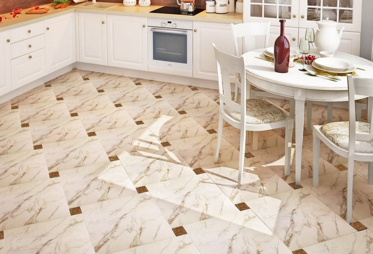 При отделке на кухне выбирают материалы, способные успешно справляться с негативными воздействиями, характерными для этого помещения. Особенно важно найти напольное покрытие, какое наделено хорошей влагостойкостью, износостойкостью, гигиенической чистотой и экологической безопасностью. Какие же материалы сгодятся в этом случае? 1. Керамическая плитка для кухни Сегодня остается очень востребованным напольным покрытием для ремонта на кухне. Напольная плитка обладает высокими прочностными показателями, не боится контакта с влагой, загрязнения с нее устранять просто даже без применения чистящих средств. Но владелец должен учитывать, что даже на самой прочной керамической плитке могут оставаться царапины при контакте с абразивными материалами или чистящими средствами. Еще одна проблема плитки – после ее укладки между элементами остаются зазоры. В них может проникать влага. Значит, особенное внимание должно уделяться герметизации швов. Без этого поверхность под напольным покрытием может пок