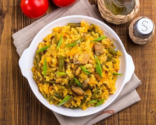 - Мясо сдвинуть к краям чаши, в середину положить перец, помидоры и жарить 5 мин. Затем добавить замороженную стручковую фасоль, белую фасоль, влить 300 мл воды и тушить 10 мин. Посолить и поперчить по вкусу.
