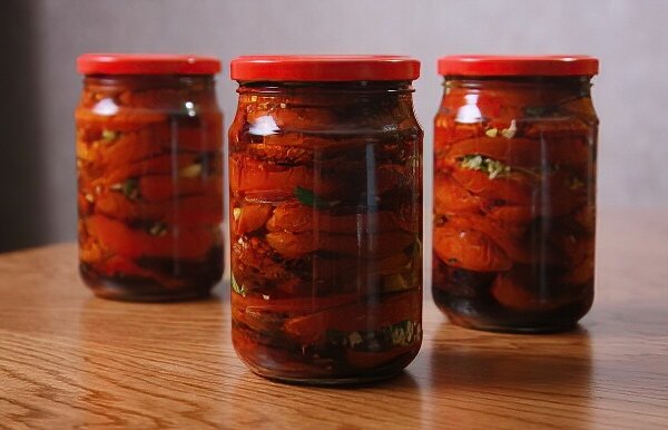 Ингредиенты: спелые помидоры – 2 кг, морковь – 4 шт., болгарский перец (цветной) – 5 шт., столовый уксус (9%) – 100 мл, растительное масло – 100 мл, чеснок – 5 зубчиков, молотый перец (чили) – 1 ст. л., соль – 2 ст. л., сахарный песок – 100 г, свежая зелень петрушки, укропа, кинзы (по вкусу). Приготовление. Морковь, болгарский перец и чеснок измельчить с помощью блендера или пропустить через мясорубку. В полученную смесь из овощей добавить сахар, соль, молотый перец (чили), растительное масло, уксус и тщательно перемешать, желательно до полного растворения сахара и соли. Зелень тщательно промыть и мелко нарезать. Помидоры (хорошо промытые и с вырезанными плодоножками) разрезать на две части. Затем выложить в предварительно стерилизованные банки. Сначала выкладывать слой из помидоров, потом слой из перемолотых овощей, а после зелень. И так до конца, пока не закончатся ингредиенты. Затем простерилизовать банки с помидорами минут 15 (в зависимости от размера банок), закатать