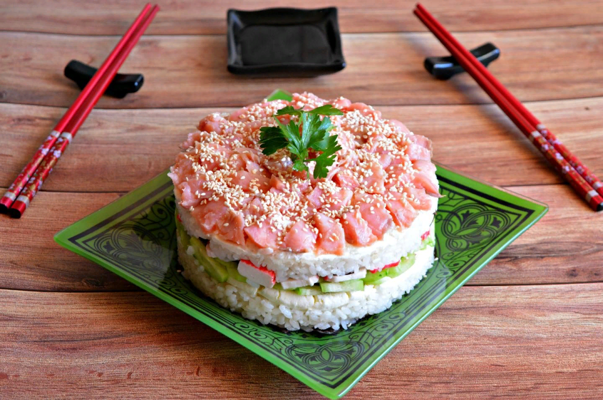 Любители суши и роллов поистине оценят это блюдо! Если у Вас нет циновки или Вы не умеете крутить роллы, а очень хочется удивить гостей японской кухней, приготовьте из этих же ингредиентов торт! На вкус не отличишь от суши и роллов, а приготовление такого тортика займет в разы меньше времени. ИНГРЕДИЕНТЫ НА 6 ПОРЦИЙ 1. Круглый рис - 1 гр.стак. (200 мл) 2. Вода - 230 мл. 3. Рисовый уксус - 50 мл. 4. Соль - 1 чайная ложка 5. Сахар - 2 столовой ложки 6. Листы нори - 5-10 гр. 7. Огурцы - 1 шт. 8. Сливочный сыр - 180 гр. 9. Крабовое мясо - 50 гр. 10. Красная рыба - 200 гр. 11. Кунжут - 2 столовой ложки Время приготовления: 40 мин ПОШАГОВОЕ ПРИГОТОВЛЕНИЕ ШАГ 1: Подготовим все продукты, необходимые для приготовления Суши торта. ШАГ 2: Берем круглозерный рис и хорошо промываем его под проточной водой. При варке риса для суши соотношение риса и воды должно быть 1:1,15. Варить рис можно как в обычной кастрюле, так и в мультиварке. Я использую мультиварку. Для варки в ка