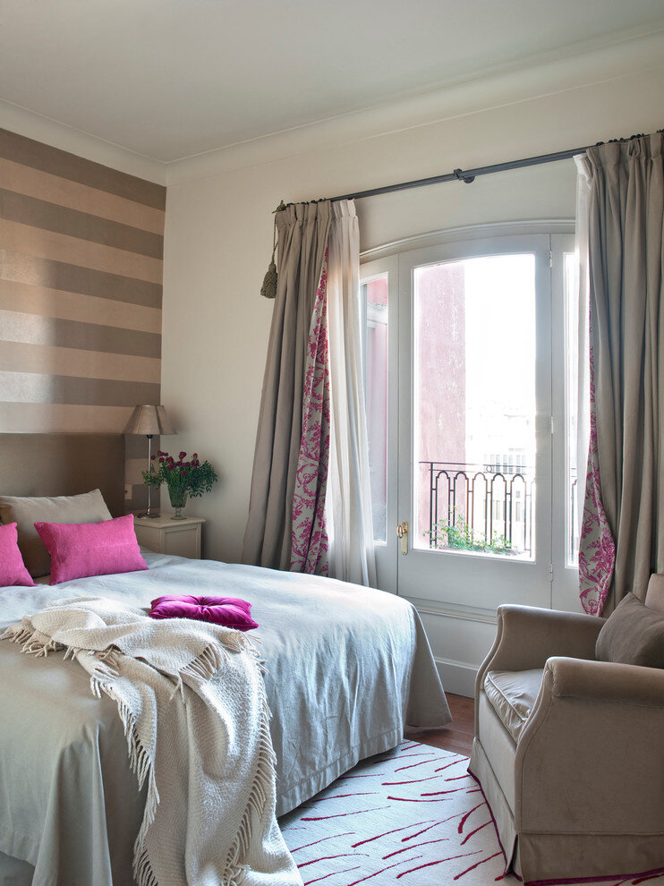 К таковым относятся — совместимость материалов, их плотность, поведение при пошиве, как сильно ткань будет мяться и прочее. Лучше изначально попросить мастера помочь с выбором, чем потом услышать, что эти два материала не совместимы и тратить свое время и деньги снова. Что же касается пропорции — часто выделяют именно нижнюю полосу, чтобы добавить помещению некой статичности. Это около 1/4 или 1/5 высоты помещения, остальная часть шьется из другого отрезка ткани.