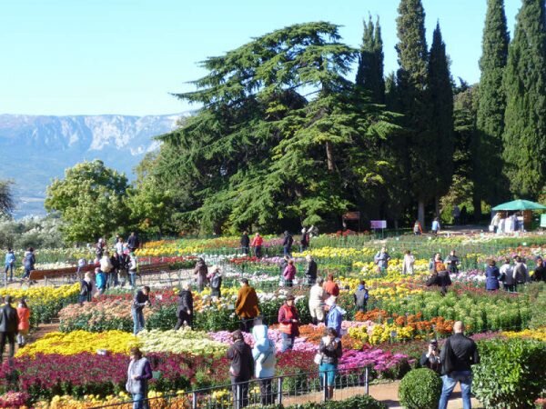 В знаменитом Никитском ботаническом саду в южнобережном посёлке Никита начался «Бал хризантем». Этот роскошный праздник буйства красок, ароматов и форм ежегодно привлекает тысячи туристов. Вы когда-нибудь слышали название «малиновый паучок» или «плюшевый мишка», «апельсиновый шар» или «симфония? Всего более четырехсот названий, представляете? Вот уж есть где разгуляться воображению! 25 октября в 66-й раз парад цветов торжественно открылся хрустальным перезвоном. Стало доброй традицией приглашать на бал исполнителя игры на бокалах, так что утончённая музыка разольётся по округе и порадует слух посетителей. Конечно, будет и оркестр и танцы. Какой же бал без танцев?! Но в центре внимания всё же будут цветы. Это настоящая живая акварель, которая «сольется» в восьмилепестковый разноцветный цветок более чем из 50 тысяч хризантем разных сортов и окраски. Его особенно хорошо видно с высоты. Перед посетителями сада предстанут как старые знакомые, так и новички – всего 472 сортов и гибридных