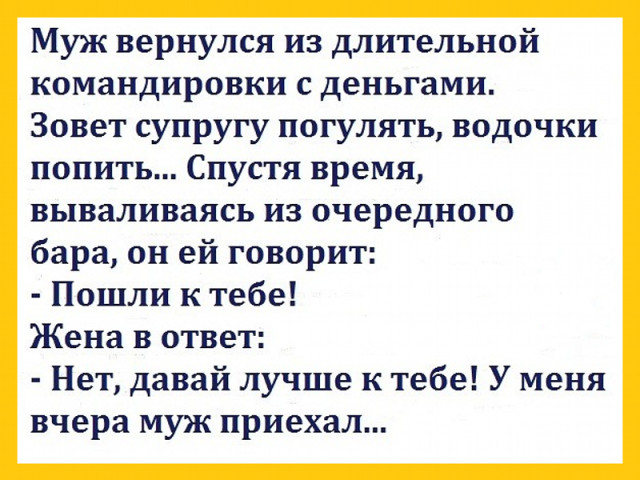 Эта публикация посвящена анекдотам на пикантную тему из цикла ( муж раньше времени вернулся из командировки ). Анекдотов на эту тему очень много, как про Вовочку, Чапаева и Петьку и многих других. Как мы все знаем, что анекдоты не пишут, как стихи или песни они берутся из жизни. Если анекдоты появляются на эту щекотливую тему, значит она актуальна и по сей день. Возвращается муж из командировки раньше времени, а у жены в квартире любовник. Она настолько растерялась, не знает куда его спрятать. Традиционно пихает его в шкаф и начинает просить бога. Боженька сделай так, что бы муж не нашел его. А за это я сделаю всё, что захочешь. Бог подумал и говорит. Хорошо я сделаю так как ты просишь, но ровно через год ты умрешь. Хорошо я согласна, только бы он его не нашел. Муж вошел в квартиру, ничего не заподозрил и не нашел любовника. Время идет, она уже забыла про свою смерть через год, живет себе и об этом не думает. Проходит год. Жена покупает круиз по морю на большом лайнере, где несколько