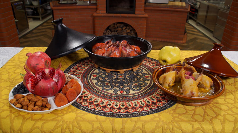 Несколько лет назад Сталик Ханкишиев создал азербайджанский десерт, отварив айву в гранатовом соке. А теперь решил: почему бы не начинить им перепелок? Ингредиенты: айва, гранатовый сок, свекла, сахар, черный перец горошком, палочки корицы, гвоздика, бадьян, перепелки, топленое масло, лук, куркума, молотый миндаль, соль. Сталик Ханкишиев: «Айва и гранат – два самых любимых восточных плода, желтый и красный». Отвариваем айву в гранатовом соке с добавлением кусочков свеклы и специй – сахара, горошка черного перца, палочек корицы, бутончиков гвоздики, бадьяна. Сталик Ханкишиев: «Перепелок можно приготовить и на обычном противне, но задуманное блюдо – глубоко восточное, поэтому мы будем готовить их в тажине». Смазываем тажин топленым маслом и добавляем нарезанный лук, приправляем чайной ложкой куркумы и заливаем пиалой воды. Накрываем тажин крышкой и жарим лук медленно и осторожно, чтобы получить почти что луковый джем. Чтобы получить пюре из айвы, используем блендер. Выкладываем с