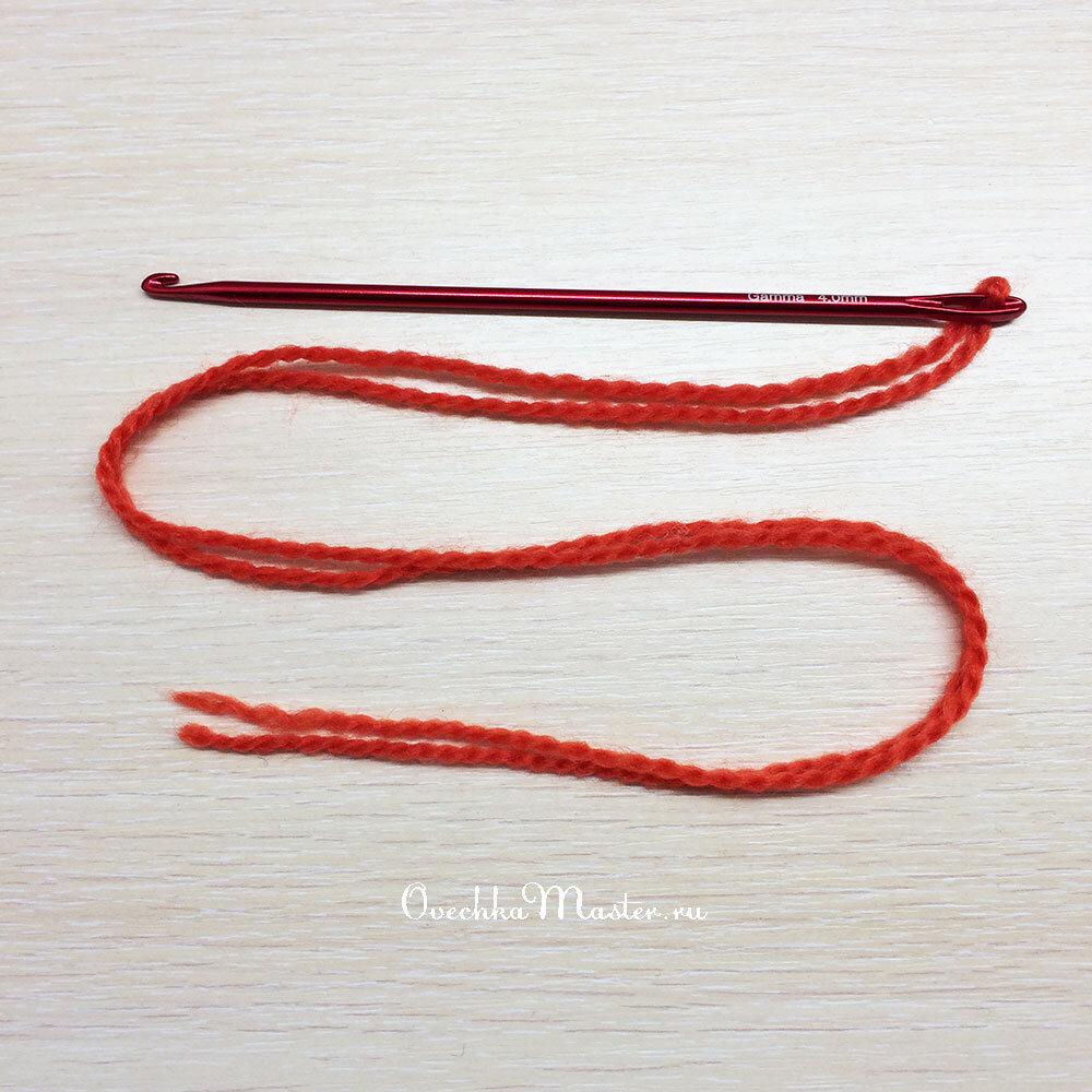 Всем добрый день. Сегодня подробно покажу, как с помощью необычного крючка (крючка-иголки) связать базовый узор только из лицевых петель. То есть как бы мы спицами при плоском вязании (не по кругу) делали платочную вязку. Итак, в самом начале нужно подготовить крючок для работы и вставить в ушко вспомогательную нить. Что касается размера нити, как рассчитать ее длину? Ну во-первых, мне удобнее работать в две нити, чтобы не переживать, что она выскочит из ушка иголочки (но можно и в одну). В любом случае длина нити должна быть не меньше следующей суммы: длина крючка + длина будущего вязаного полотна + еще минимум 10-15 см для хвостика. И если работаем в две нити, то умножаем это все на два. У меня будет небольшой образец, поэтому на фото как раз видно, что длина нити - это примерно 3 длины крючка. Итак, сначала нужно набрать петли. Это можно сделать любым способом, как и в тунисском вязании. Я покажу пример набора петель из цепочки, так, чтобы внизу была красивая косичка. Вяже