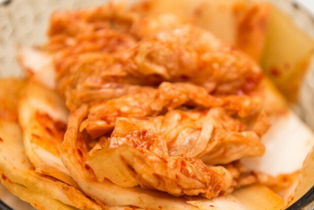 ИНГРЕДИЕНТЫ Вода 300 мл Китайская капуста 3 кг Лук репчатый 1 головка Китайские груши 1 штука Мелко рубленный чеснок 6 столовых ложек Тертый корень имбиря 1 столовая ложка Соль 2 столовые ложки Сахар 1 столовая ложка Рыбный соус 100 мл Дайкон 300 г Зеленый лук 2 пучка Рисовая мука 3 столовые ложки Соус кимчи 1 стакан ИНСТРУКЦИЯ ПРИГОТОВЛЕНИЯ 1. Капусту нужно слегка промыть, разрезать вдоль на две части, вырезать кочерыжки. Затем окунуть в воду, чтобы вода попала между листьями, это необходимо для того, чтобы соль равномерно распределялась в капусте. Далее берем соль крупного помола и равномерно распределяем между листьями. Отрываем 3–4 крупных листа капусты и так же солим. Они нам пригодятся потом. Полукочаны кладем в емкость, заливаем воду, чтобы они были полностью в воде и придавливаем сверху. Оставляем засаливаться примерно на 6–8 часов. Примерно через 3 часа капусту необходимо перевернуть (нижние половинки поменять местами с верхними).
