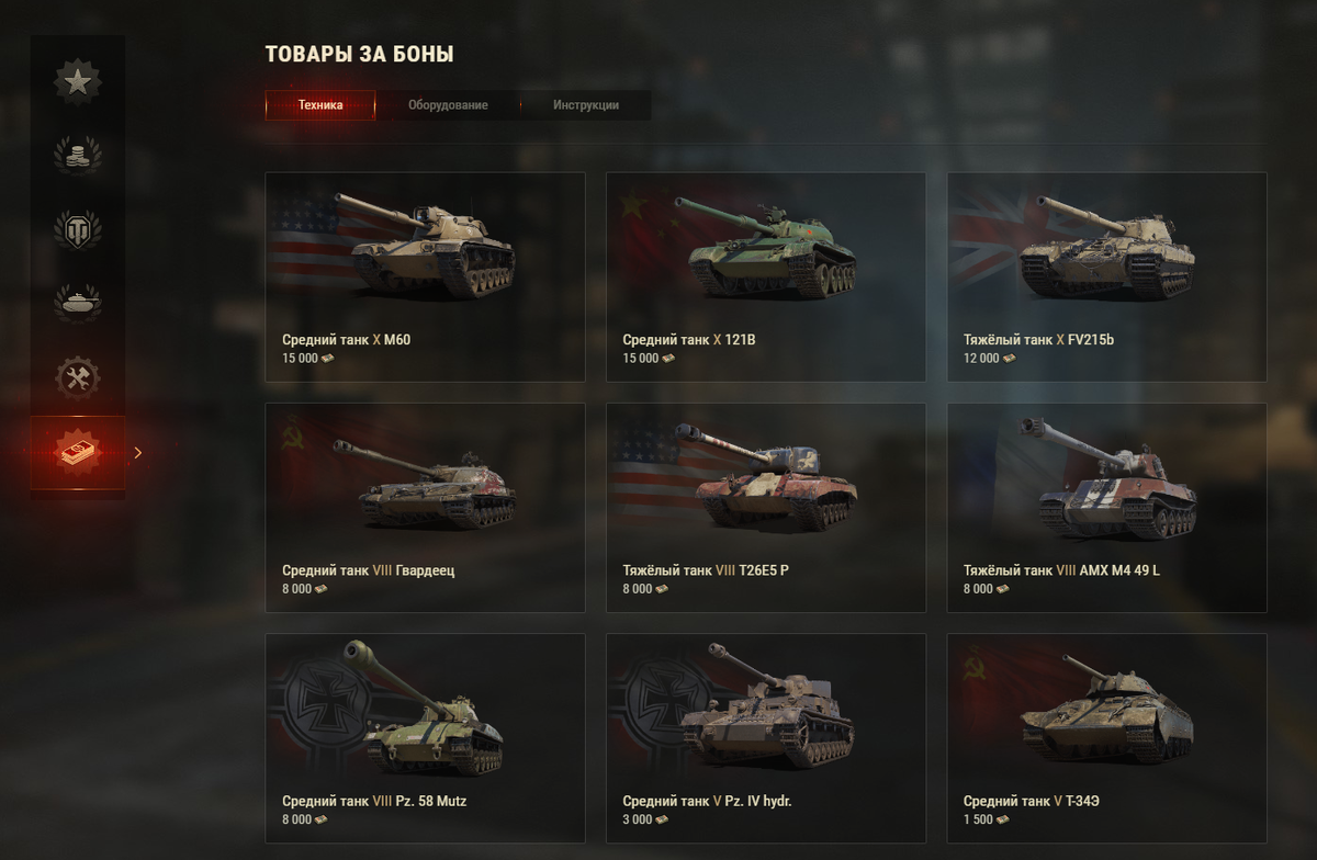 Я не доволен ценой в бонах за такие редкие танки, особенно М60 и 121В. Я не годую из-за того, что 2 недели играл ивент на глобальной карте, а сейчас они просто продаются за боны. Десятки , лично моём мнение, должны стоить минимум 20 тыщ бон, иначе это слишком дёшево. За восьмёрки от 10 тыщ бон, а пятёрки я не понимаю зачем нужны, кроме "гидростата", да он очень редкий и поэтому интересен.