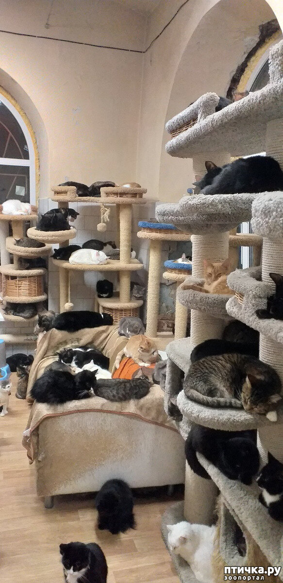 В приюте есть специальные огромные комплексы до потолка с полочками, когтеточками и домиками, бортиками, чтобы кошкам было где расположиться.