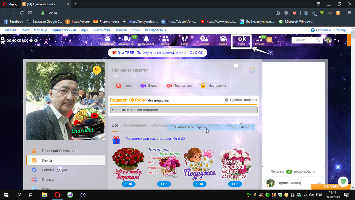 В обход админа ok.ru по установке темы на странице в одноклассниках Наверно всем знакома проблема по оформлению темы в ok.ru. Где-то в конце лета сего года я обратил на некорректную работу опции по оформлению темы в одноклассниках. По началу сократилось количество тем в опции по выбору тем. Потом ранее установленная тема с каждым днём становилось всё бледнее. А потом вообще исчезло. Админ сайта ok.ru убрал пункт украсить свою страничку. Всем в последнее время стало приятнее пользоваться тёмной темой, как в самой windows 10 all, так и на сайтах и приложениях. Даже программа Adguard 7.2 предлагает пользоваться тёмной темой. Призадумался как найти путь к этому решению. По скольку я пользуюсь в основном одним браузером Opera 64. И тут мне вспомнилось одно расширение oktools которым пользовался ещё на windows 7 ult. Решил это расширение применить и на windows 10 1909. Вошёл в интернет-магазин по расширениям. По поиску обнаружил расширение ok.tools, установил, и нажав по значку при котором