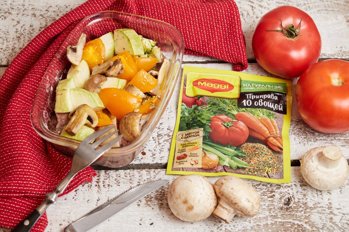 Обвалять отбивные в муке и посыпать MAGGI® Приправа Весенняя зелень. Помидоры и кабачок нарезать кубиками. Брокколи разобрать на небольшие соцветия. Грибы разрезать пополам или на четыре части. Смазать маслом форму для запекания и выложить отбивные. На них положить овощи, полить сметаной, накрыть форму фольгой и поместить в духовку, разогретую до 180 градусов, на 30-35 минут.