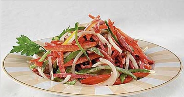 Стручки сладкого перца очистите от сердцевины и нарежьте очень тонкой соломкой. Репчатый лук очистите и нарежьте тонкими кольцами. Салями нарежьте соломкой.