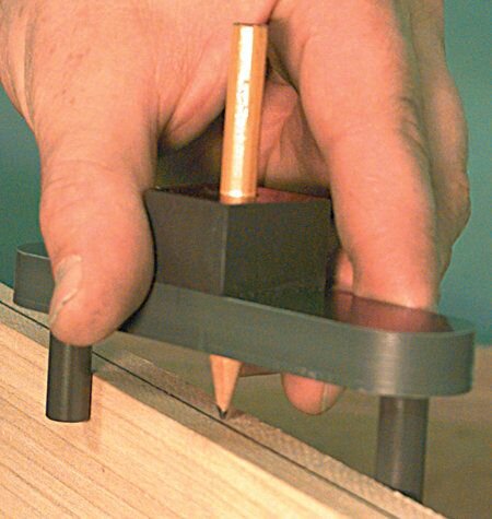 Если вы часто работаете с деревом, в том числе с мебелью, у вас может возникнуть необходимость разметить центр для кромки изделия. В этом может помочь самодельная приблуда - центровик. Как ее сделать своими руками? Для этого нам понадобится: В бруске делаем отверстия под чопики (они должны быть на равном удалении от краев бруска по длине и по ширине), сажаем их на клей. То же самое проделываем с карандашом. Карандаш должен находиться в точности по центру бруска. Важно: выступающая длина карандаша должна быть меньше длины чопиков. Простенький инструмент для разметки осевой линии готов!