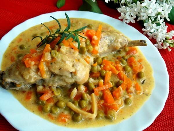 Кролик тушеный с овощами – вкусное простое блюдо из кролика в сливочном соусе с добавлением моркови и зеленого горошка. Блюдо нежное, легкое, а овощи с мясом очень мягкие. Рекомендую на семейный обед или ужин, потому что его могут есть даже маленькие дети.