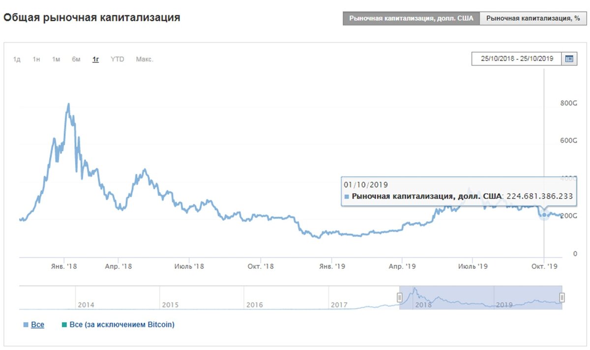 По данным глобального финансового портала Investing.com, на 1 октября 2019 года общая рыночная капитализация криптовалют составила $225 млрд., это порядка 14.5 трлн. рублей. Для сравнения: количество рублей, находящихся в обращении, оценивается суммой не более 10 трлн.