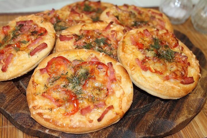 Домашние мини-пиццы с ветчиной и помидорами черри