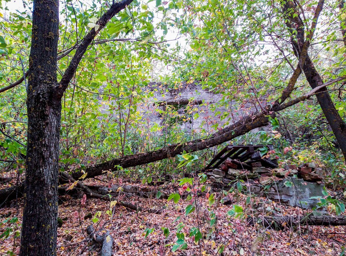 Этот дом в полностью заброшенном поселке мы вместе с Саньком, автором канала "Мир прошлого", еле заметили. Он находился в очень-очень густых зарослях. Пробираться сквозь них тоже было не совсем приятным занятием. Но все-же мы преодолели эти ветки и подошли к дому. Он также, как и все дома в поселке был шлаковым. И тоже без крыши, потолка и окон с дверями. Недалеко от руин дома лежала груда кирпичей. Наверное, это был какой-нибудь сарай, который от времени разрушился. Рядом с этой грудой кирпичей лежали два деревянных поддона. Скорее всего, их кто-то принес сюда уже после того, как поселок был заброшен. Возле поддонов лежал деревянный круг, который, скорее всего был от катушки, на которую наматывался электрокабель. Такие мы уже видели в предыдущих домах, что мы посетили в этом поселке. Давайте теперь заглянем в дом. Там - целые заросли крапивы, которая почему-то склонилась к земле и довольно массивное дерево американского клена. Окна в этом доме были заложены кирпичами. Между собой эти